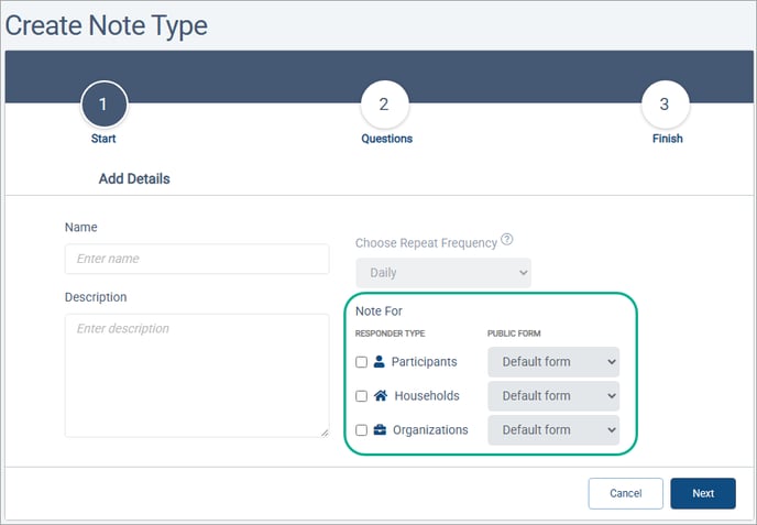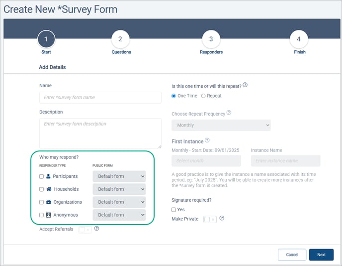 For both Survey Forms and Note Type Forms, a Public Form dropdown is now available in Step1 of the Form Creation Wizard. Now,when you select who the form is for, you can choose the public form to use for new responders who complete the form. A Public Form is a personalized version of the entity form for making sure the right information is gathered from the person completing the form in a particular context, like a "Volunteer Interest Application."