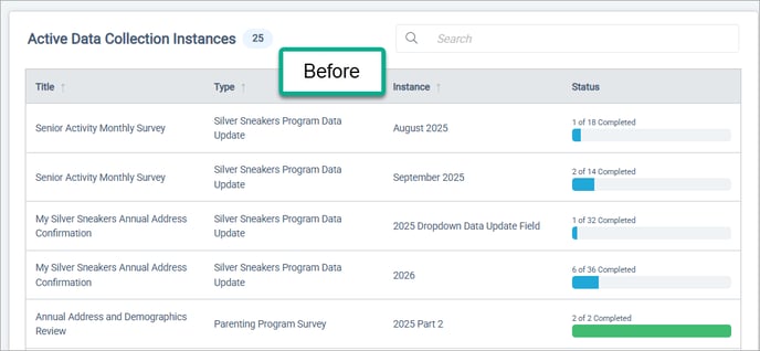 The Active Data Collection Instances section of the Homepage is now called the In Progress