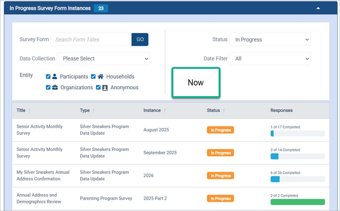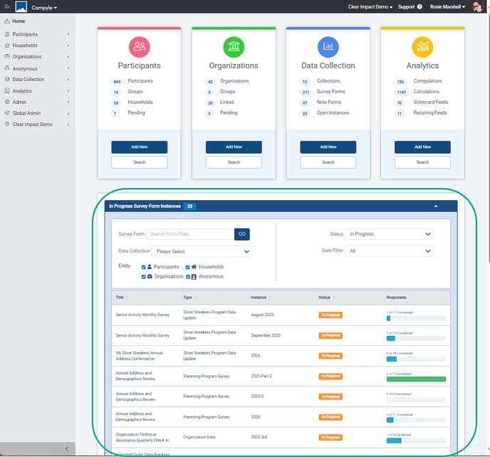 Homepage: Active, In Progress Survey Form Instances
