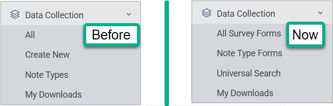 In the left sidebar navigation menu, the Data Collection section has several wording updates for increased clarity. Universal Search has been added, and the rarely used "Create New Data Collection" link has been removed.