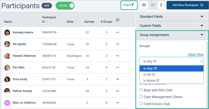 - Is All Of: participants have to be a member of every group selected