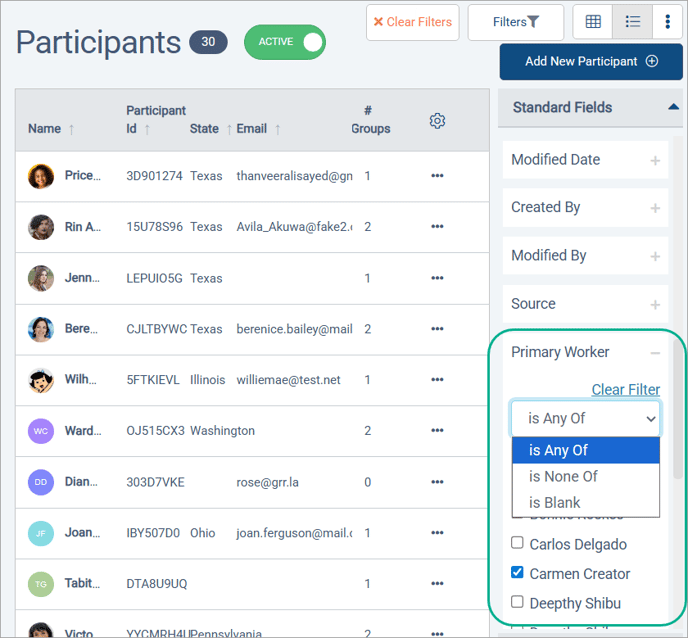 - is Any Of: participants with one of the selected users for their primary worker
