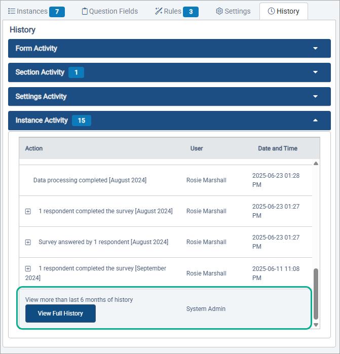 The Section Activity, Settings Activity, and Instance Activity sections default to showing the past six months of activity records. There option to view the entire history can be found at the bottom of the activity list for each section.