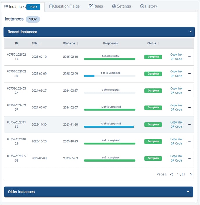- Older Instances: By default, all instances for the prior two years with the option to view all prior instances.