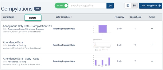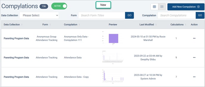 The Compylations list now has filters for data collection, form name, and compylation name. Similarly, the data collection, form name, and compylation name are displayed as separate, sortable columns.