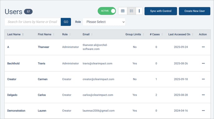 The user list shows active users by default. As with other Compyle lists, the Active/Archived switch at the top can be used to view archived users. The new Group Limits column shows at a glance if a non admin user is limited to only certain groups of records. This can be helpful when comparing permissions for users in similar positions.