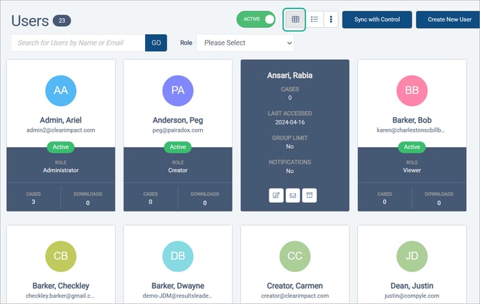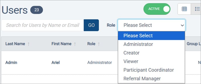 When searching for users, you can search by the name or email of the user. You can now filter by Role, which includes custom options as well as the built-in Administrator, Creator, and Viewer permissions.