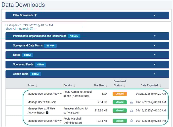 Files produced by the User List Exports will appear in the Admin Tools section of the Data Downloads page.