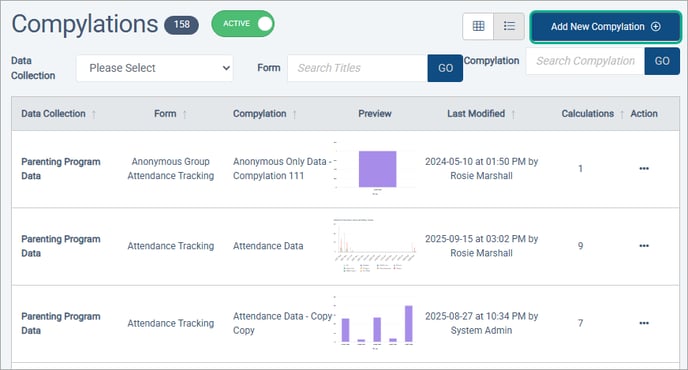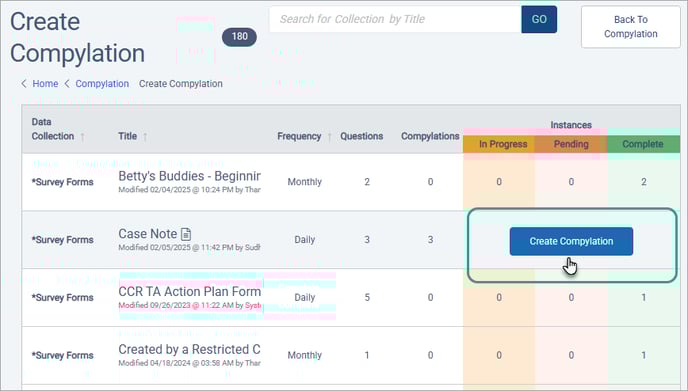 Hover over the survey whose data is to be analyzed, and click Create Compylation.