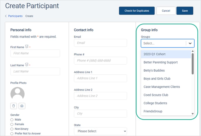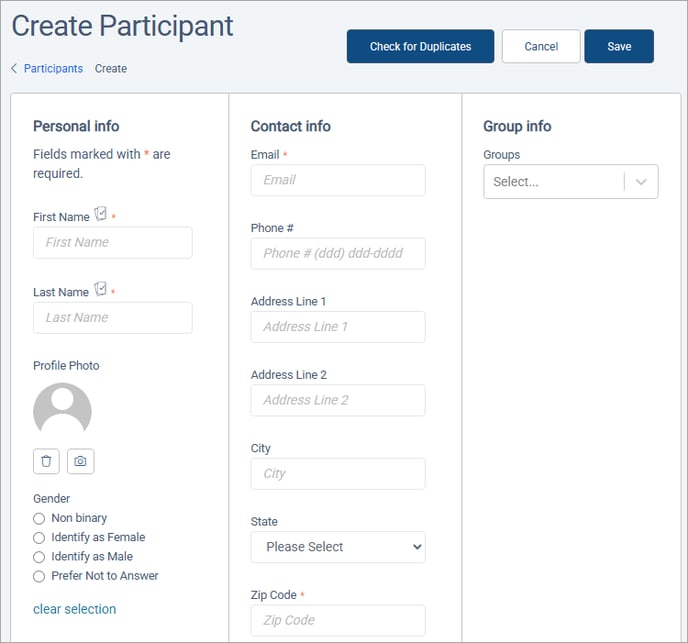 On the participant creation page, enter personal info and contact details. You can upload a profile photo as well. The gender and race fields come with standard default options, but admin users can customize options for these fields.