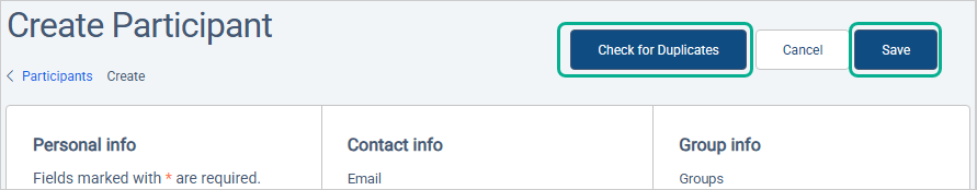 When finished, be sure to click Save at the top or bottom right. If Duplicate Check is active, you will need to click the Check for Duplicates button before you can click the Save button.