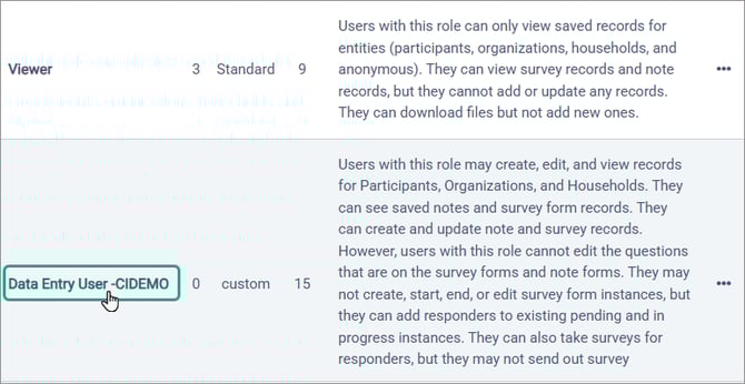 The standard roles may not fit every staff or volunteer position. There may be users who need some but not all of the permissions that a standard role includes. Maybe some staff need a little bit more access than a Data Entry User but not as much as a Creator. Or there might be a staff person whose time is split between two departments, and so they need unique access. Custom roles allow you to fill these gaps.