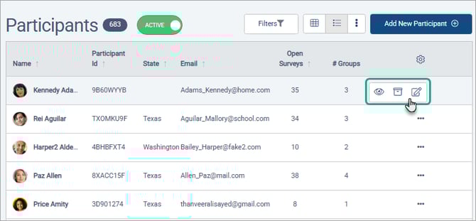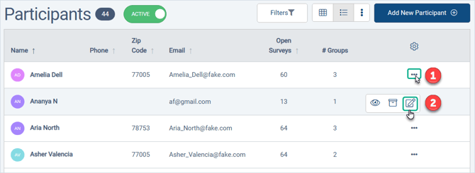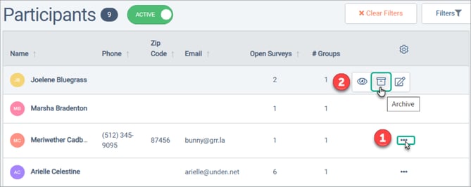 In the active search results, the ... three-dot menu will appear for each participant or organization. Hovering your mouse over this menu will display three of these options: View, Archive or Delete, and Edit.