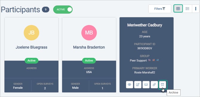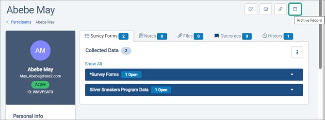 Participants and Organizations may only be archived and not deleted if they have any additional records. This is a precaution to prevent accidental removal of information that is needed later. These records could be completed survey form responses, note form entries, or uploaded documents. Archived records can be restored later if needed from the inactive records search.