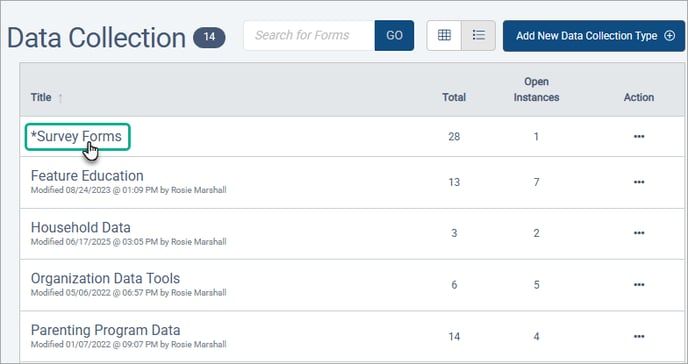 To edit either the details of a survey or its questions, first find the data collection category for that survey form.