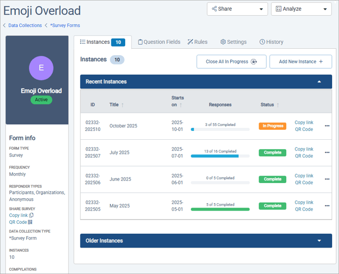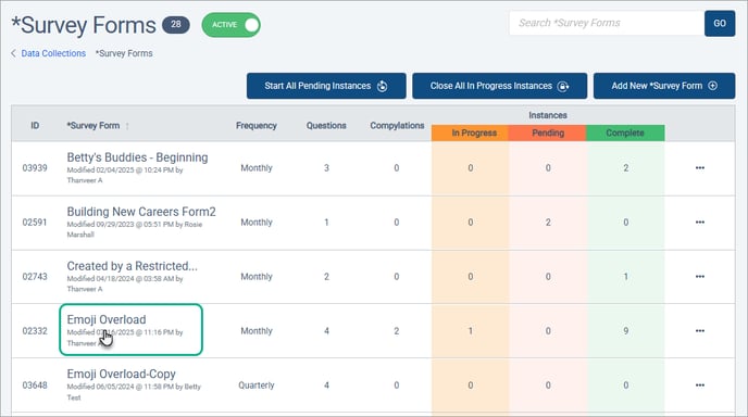 Survey and Note Forms can be edited to meet evolving needs. Keep in mind that any new fields added to a survey form will be added to future survey instances but not to any completed or in progress instances.