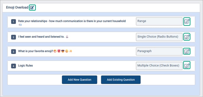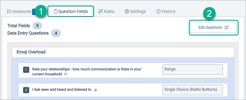 To add or edit survey questions, click Edit Questions. Field types cannot be changed once a field has been saved to a form. Also, new fields will only appear on new survey instances and will not be added to in progress or completed survey instances.