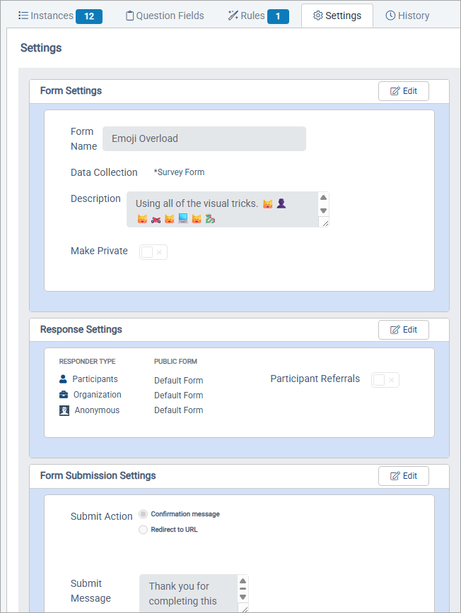 On the Form Management Folder's Settings tab, you can change the survey’s name, description, or frequency, make it private, or change its data collection or public form. (The public form is filled out by participants not already set up in the system, who receive a survey instance URL.) You can also choose whether respondents will see a confirmation message upon completing the survey or be redirected to a URL. If you make any changes, click Save at the top of the settings section.