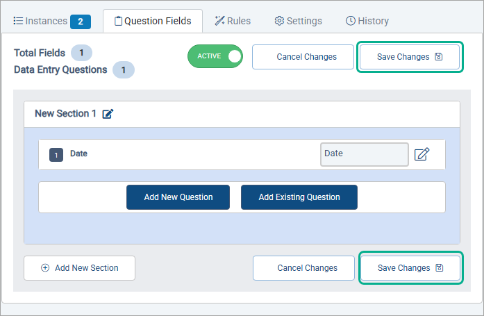 When finished editing questions, save your changes. The Save Changes button can be found at both the top and bottom of the list of fields and sections.