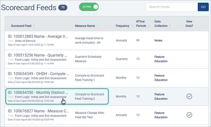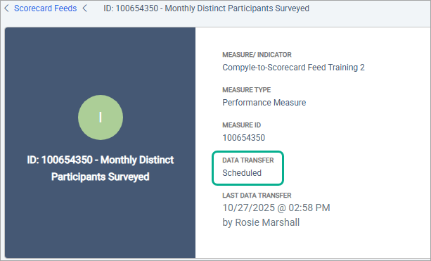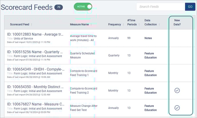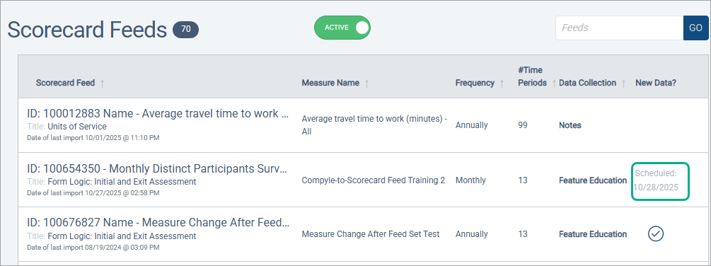 In the scorecard feeds list, scheduled feeds have the next transfer date listed in the New Data field.
