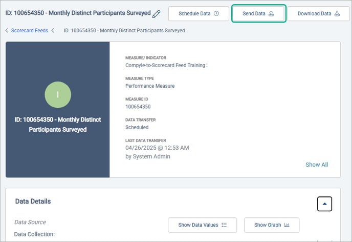 Note: Even if a scorecard feed is set to push data at a set schedule, you can still open the feed and click Send Data at any time, to push the most current data.