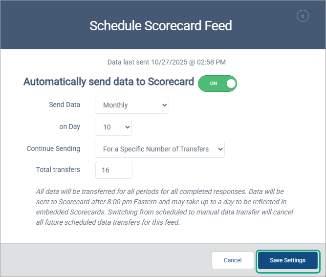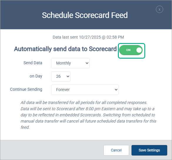 The scheduling window will open. In the scheduling window, switch the slider for Automatically send data to Scorecard to the "On" position.
