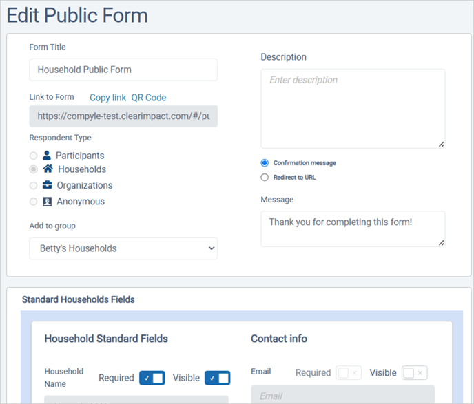 In Step 1 of the Create Public Form wizard, select Households for the Respondent Type. Enter a title and select a group for new records if you wish. Complete the rest of the steps and select the Household form fields to include in the new Public Form.