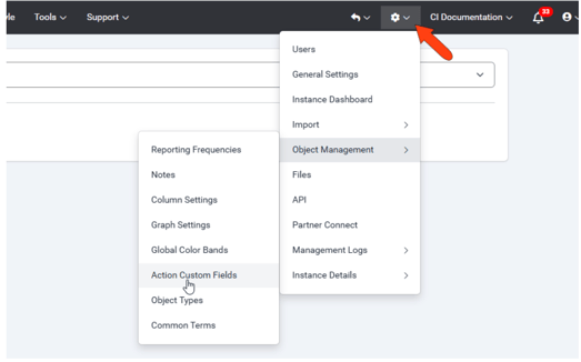 If there are specific fields you use often for actions, you can configure custom action fields. Click the Administration icon and choose Object Management / Action Custom Fields.