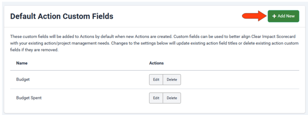 This opens the Default Action Custom Fields page, where you can use the Add New button to add fields that will appear in new actions. (Existing actions will not be updated to have these fields.)