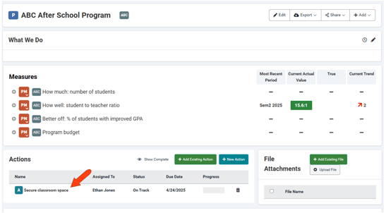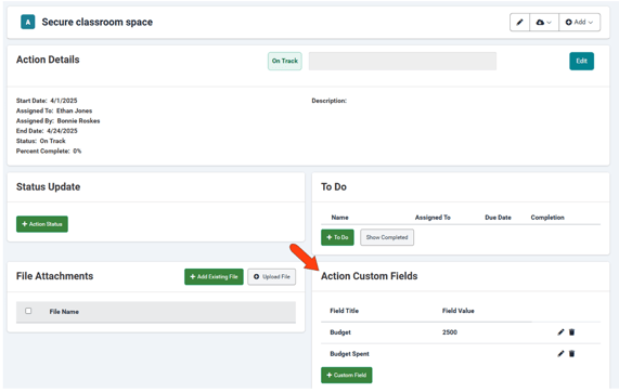 Once action custom fields are configured, they will appear in new actions. In this example, a new action was added to a program, via the New Action button.