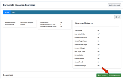 To add an existing container to a new scorecard, or while editing an existing scorecard, click Existing Container.