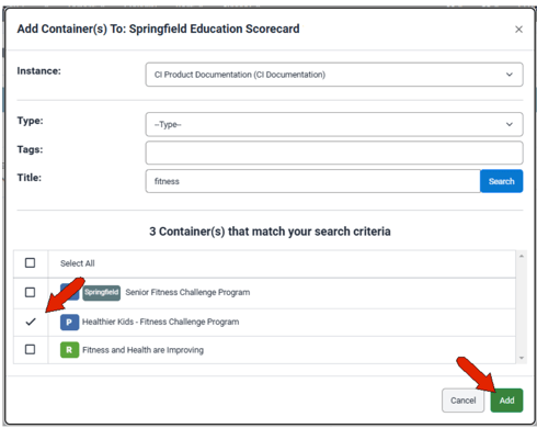 You can filter the search by Type (results or programs), Tags, or a keyword in the container Title. From the results, choose the container(s) to add, then click Add.