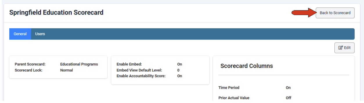 Once all containers are added and configured, scroll to the top of the scorecard page and click Back to Scorecard. This opens the scorecard view.