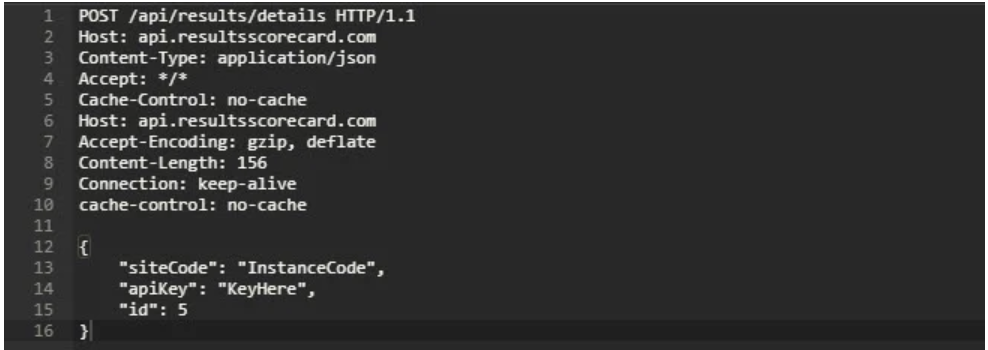 All data submitted by the API client is sent as a JSON payload of the POST request. This payload consists of some common data, such as the sitecode and API key, and some API specific data, for example an ID of a database object.