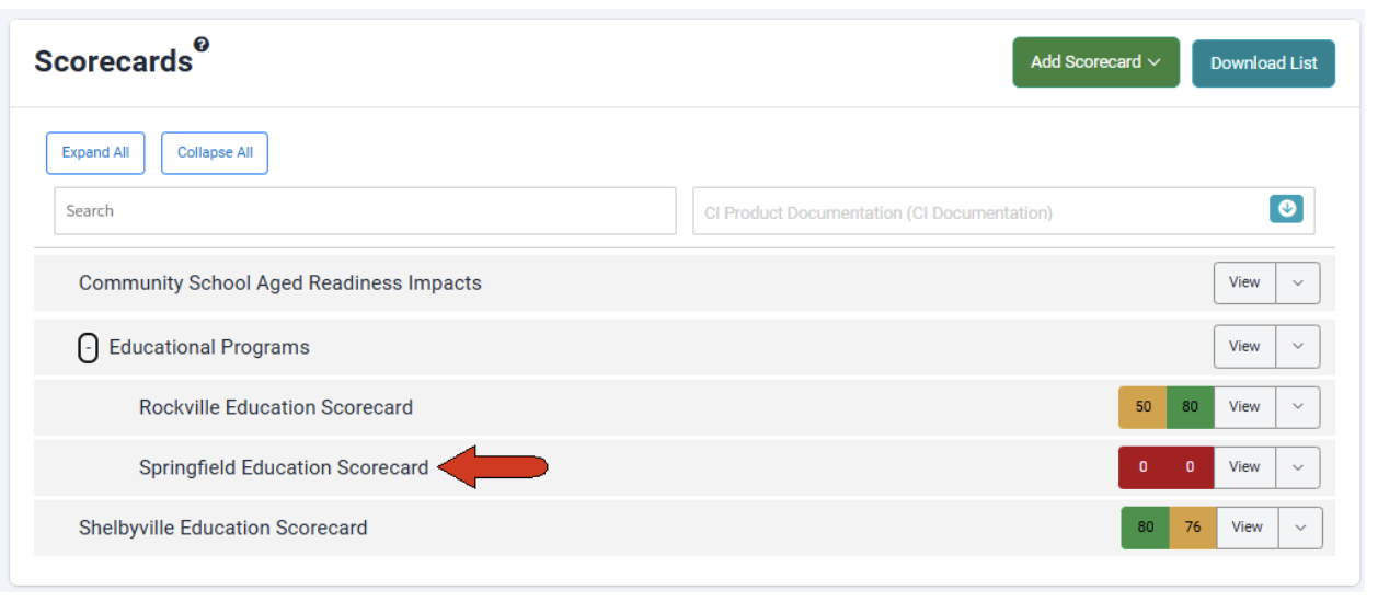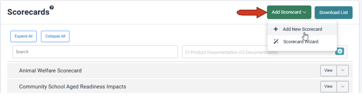 This opens the Scorecards list. At the top right, click Add Scorecard / Add New Scorecard.