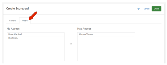In the Users tab, you can select the users who can access this scorecard. If the Has Access field is left empty, then all users will have access. By default, admin users automatically have access to all scorecards. User roles, as well as scorecard permissions, can be set in the Users list (admin users only).