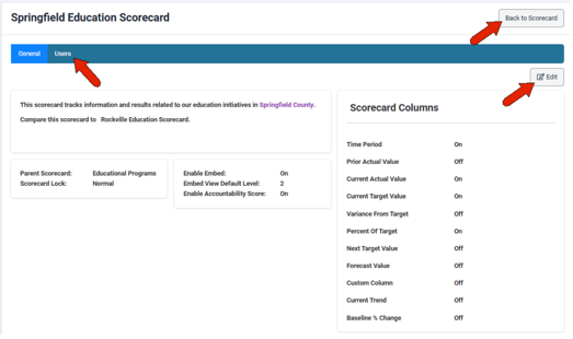 This brings you to the scorecard editing page, open to the General tab. You can click Edit to change any fields in this tab, or click Users to change user access. Clicking Back to Scorecard will take you to the scorecard view.