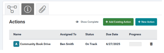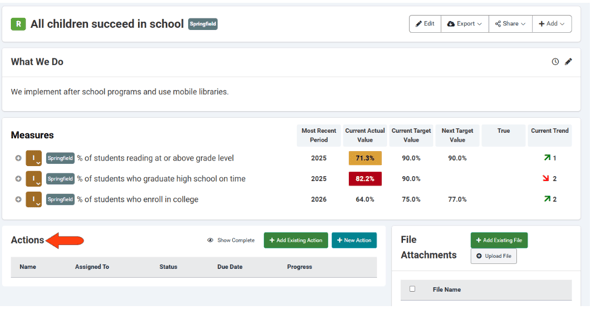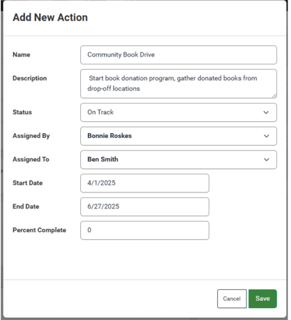 An action is a specific project, task, or initiative, created and assigned with the goal of improving a result, program, or measure. Actions are created with start and end dates, they can be assigned to team members, and their status can be updated as the action progresses.