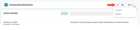 When editing an action, the icons across the top can be used to Edit the action name or add tags, Export to PDF or Word format, or Add the action to a container or measure.