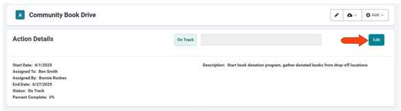 The Action Details section has its own Edit button, which you can use to change action description, status (on track, behind or ahead of schedule, etc.), assigner / assignee, start and end dates, and percent completion. After saving changes, the assignee will be notified by email.