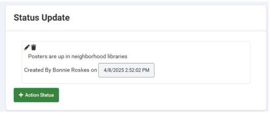 Status Update: Those working on the action can click Add Action Status to let the team know of any updates issues. An action can have unlimited status updates. Each status update can be edited or deleted.