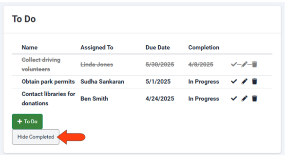If needed, clicking the check mark of a completed to-do reverses its completion status. To show only incomplete to-dos, click Hide Completed.