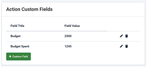 Action Custom Fields: Click Add Custom Field to create action-specific fields that can be used to better align Scorecard with your project. These fields will appear after the action is saved.