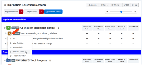 When viewing the scorecard, click the icon for the measure whose data you want to enter, and choose Add Data Values.