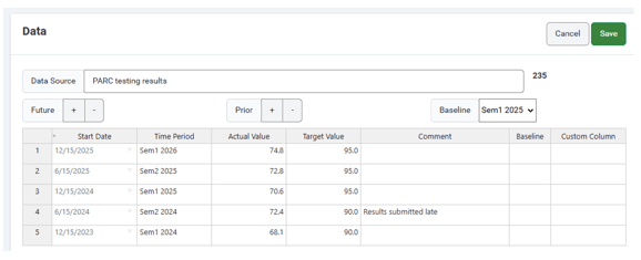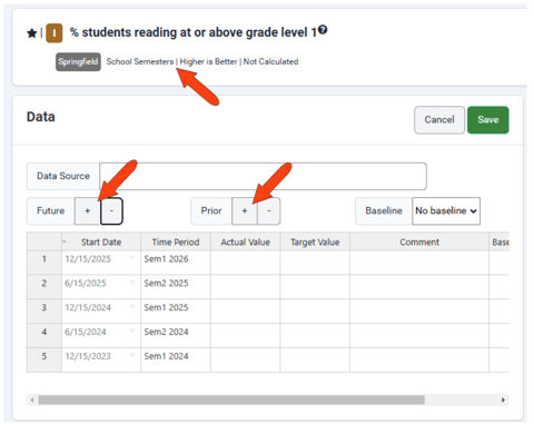 To add data rows, click the Add icon for Future and / or Prior. Rows are added according to the measure’s frequency, such as monthly or annually. In this example, the measure uses a custom frequency created for school semesters, with dates in December and June each year.