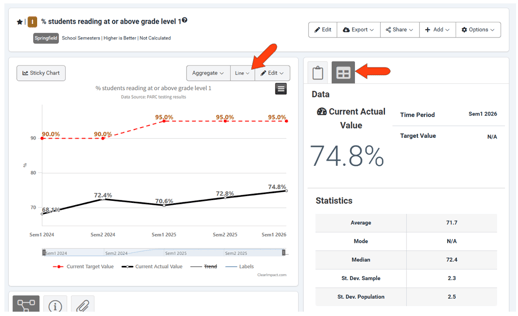 Click Save when finished, and the data is presented in a line or bar graph. The Data section on the right presents statistics on the entered values.