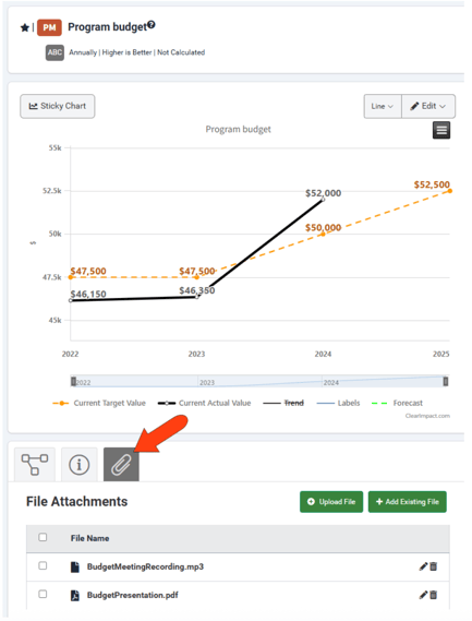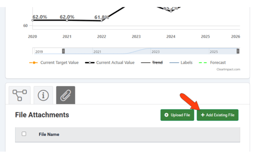 When viewing a program or result, or viewing a measure, the File Attachment section is where you can upload a new file or add an existing file.
