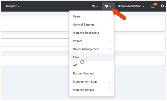 To see all uploaded files in your instance, click the Administration icon and choose Files.