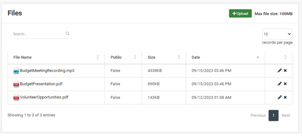 The Files list displays all uploaded files. The table can be sorted by clicking any column header, and the search field can be used to locate a specific file. New files can be uploaded here as well. Public files will be included in embedded scorecard objects.