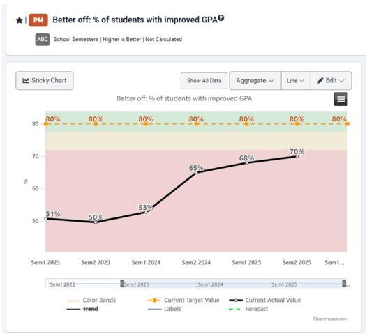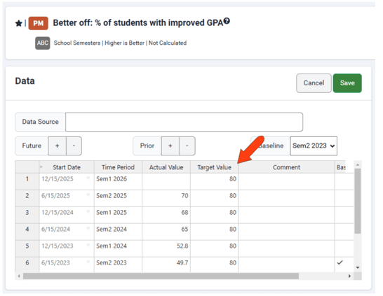 As long as a data set includes target values, you can enable color bands when viewing or editing a measure. This helps viewers understand data in terms of color-coded ranges, such as on-target, too low, etc. The way color bands are applied depends on measure polarity.